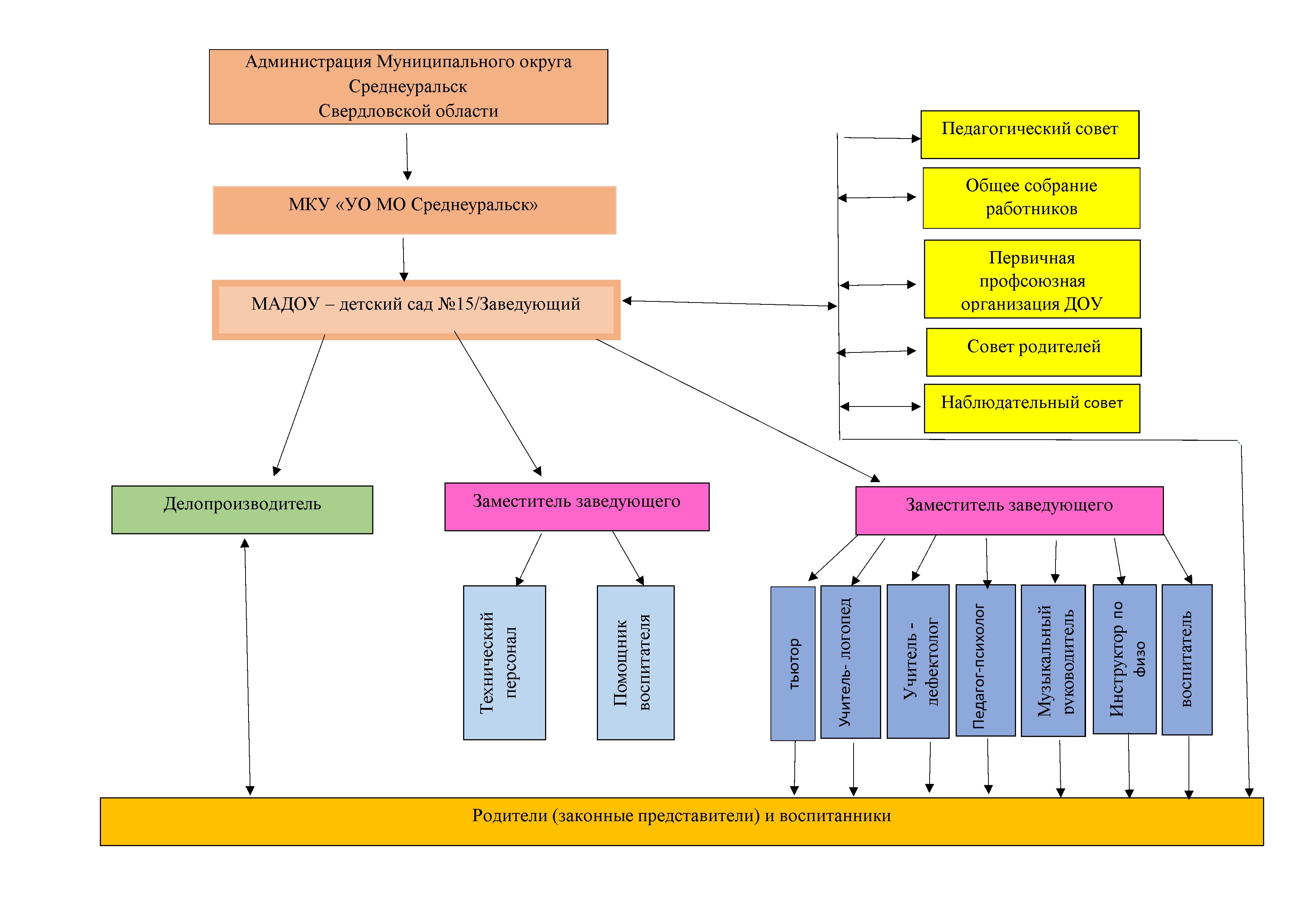 Коллегиальные органы управления Учреждением: Педагогический совет, Общее собрание работников Учреждения, Совет родителей (законных представителей), Наблюдательный совет, первичная профсоюзная организация.